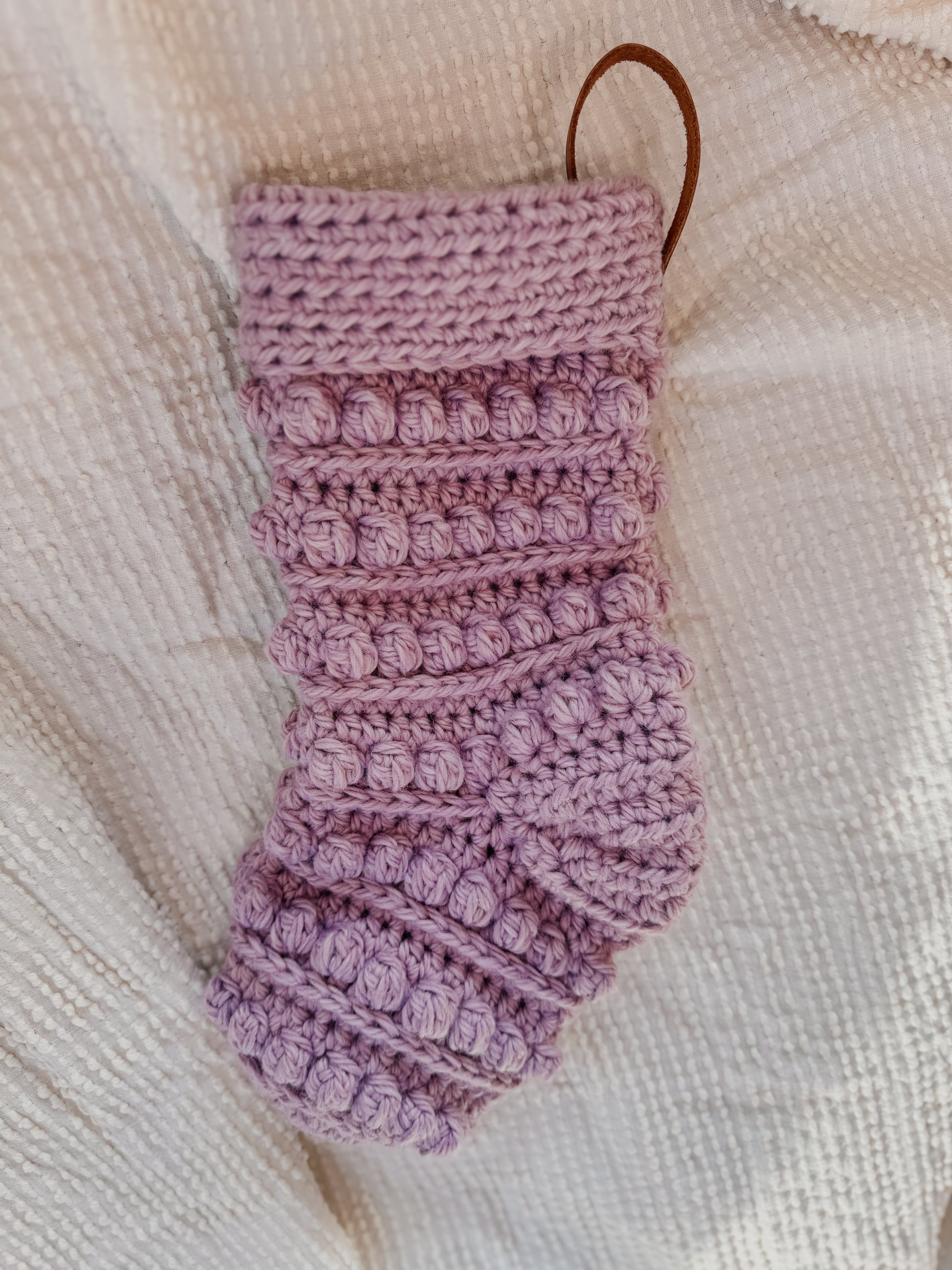 Custom Camino Stocking in Lion Brand Basic Stitch Thick and Quick in the color Lilac with leather hanger for Liz