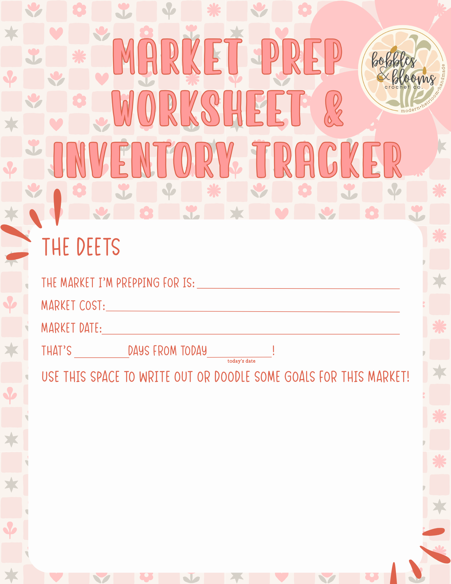 This inventory and market prep planner and tracker will help the handmade maker plan for and carry out an intentional market prep plan and crush their market prep! There are spots for writing/doodling goals, calculating how many days until the market to make items, and tracking how many items have been made, as well as keeping track of inventory on market day. This tracker can be helpful for any maker who sells at markets!